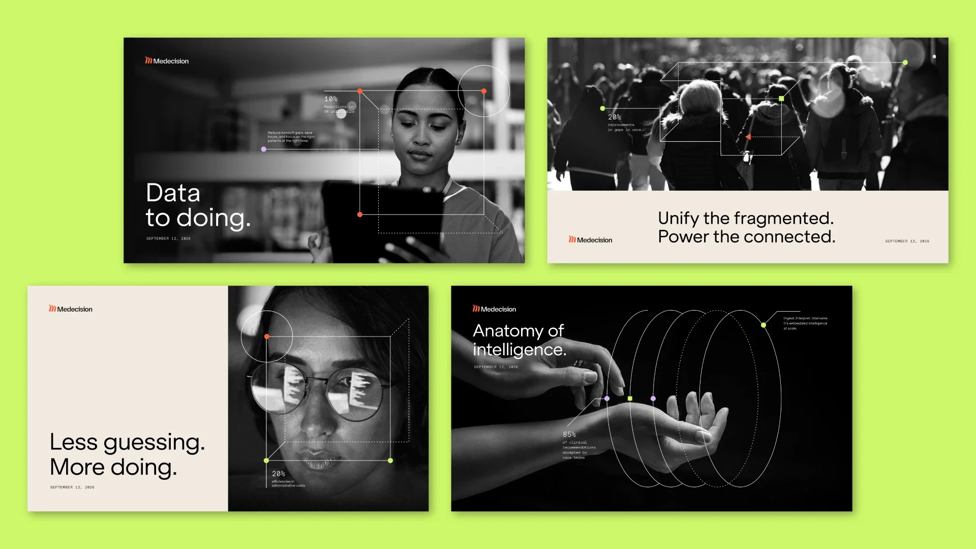Medecision offers innovative technology to healthcare organizations. In a world that’s sprinting ahead, the healthcare industry is still crawling. Manual processes, outdated information and bureaucratic systems prevent health plans and providers from turning fragmented data into timely care. With a real-time data platform, AI capabilities and a team of consultants, Medecision had the potential to transform the industry. But the brand’s former visual identity didn’t adequately capture the innovative spirit.